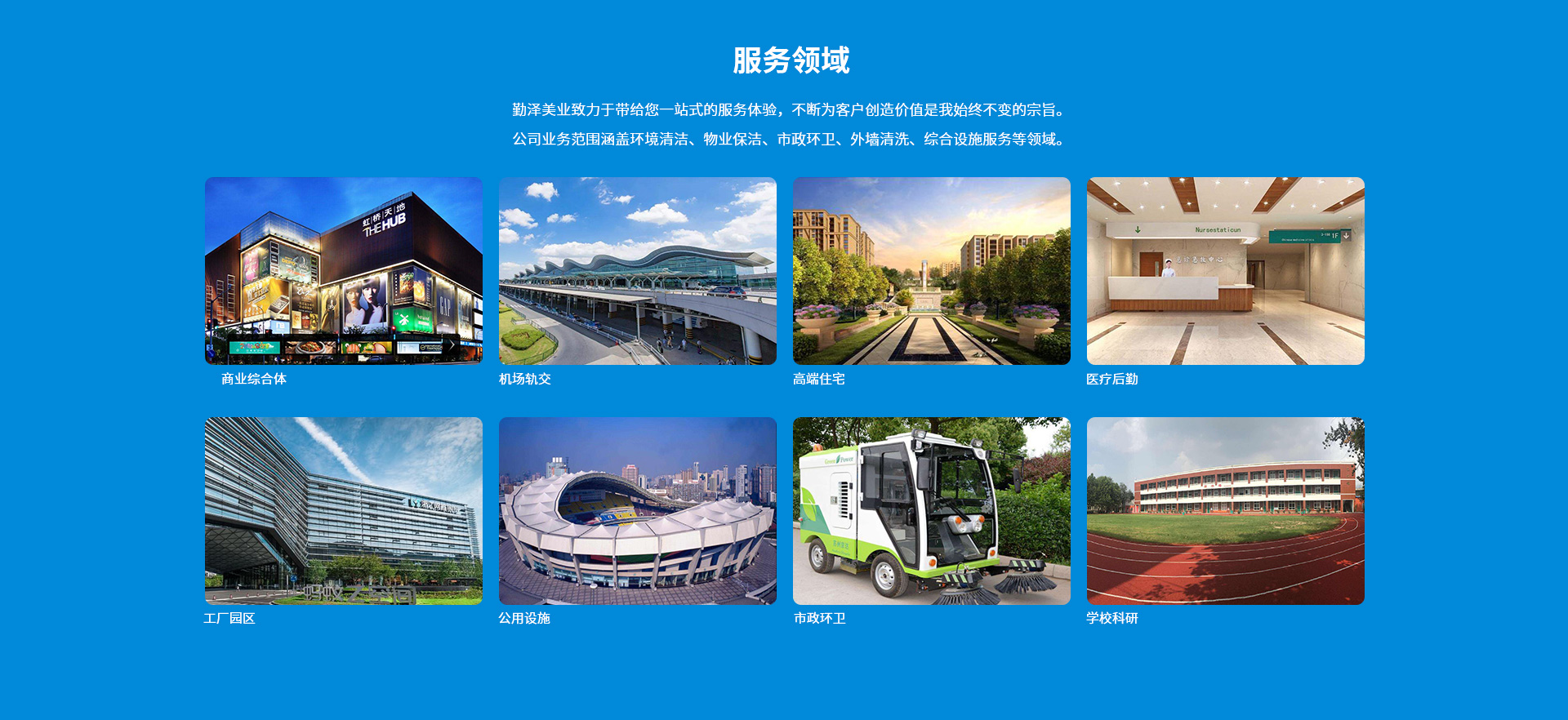 公司致力于把“勤澤美業”培育成眾口皆碑、令人尊敬、具有長期價值的服務領袖品牌。業務范圍涵蓋環(huán)境清潔和綜合設施管理服務,公司具備環(huán)衛、保潔、石材等多個行業一級資質,致力成為中國環(huán)境服務行業的領導者。